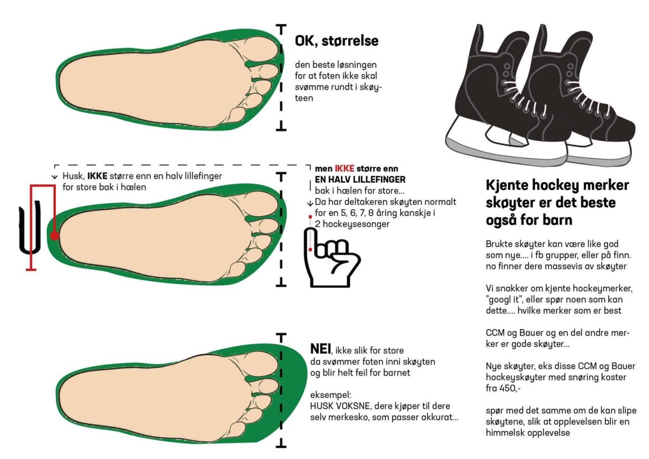 - Skøyter (alle typer skøyter er ok for de første gangene). Hvis dere skal kjøpe nye skøyter, så velg hockeyskøyter med snøring. Dersom barna ikke har egne skøyter, kan dere låne det av oss.