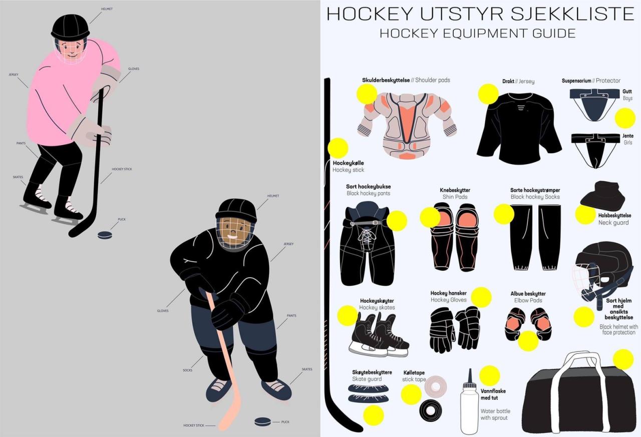 - Hjelm (sykkelhjelm fungerer bra i starten). Vi har utlåns-ishockeyhjelmer som har gitter for å beskytte ansikt. Hjelmene har forskjellige størrelser, og kan justeres etter barnets hode. Har dere behov for å låne hjelm, må dere være tidlig ute, slik at dere får gjort dette før treningen starter.